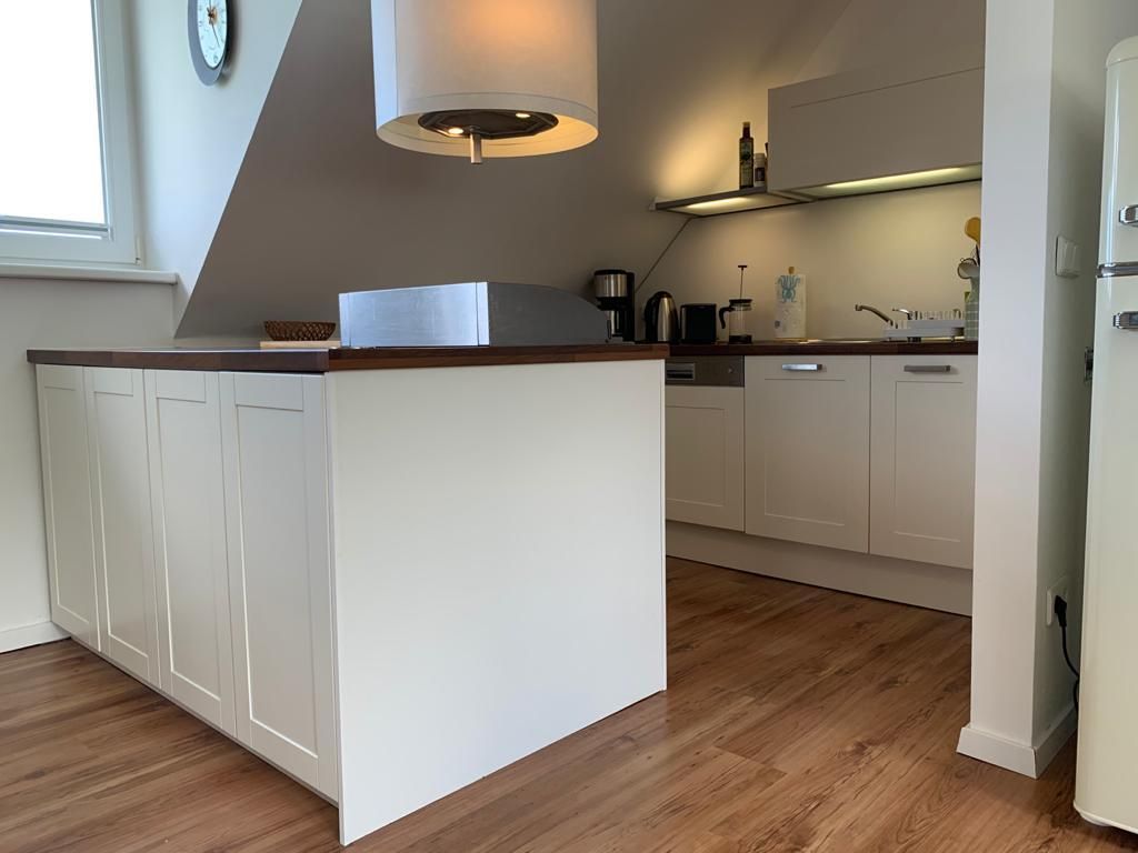 Die Küche ist ausgestattet mit einem Kühl-/ Gefrierschrank, einem Geschirrspüler sowie einem Kochfeld mit Herd.